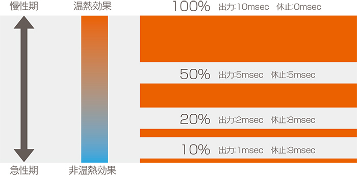- 超音波出力のデューティー比を切り替えることで、超音波の生体への働きを変えることができます。