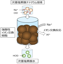 実際の製造では、樹脂を詰めたカラム中に次亜塩素酸ナトリウム溶液を流して次亜水を製造する。