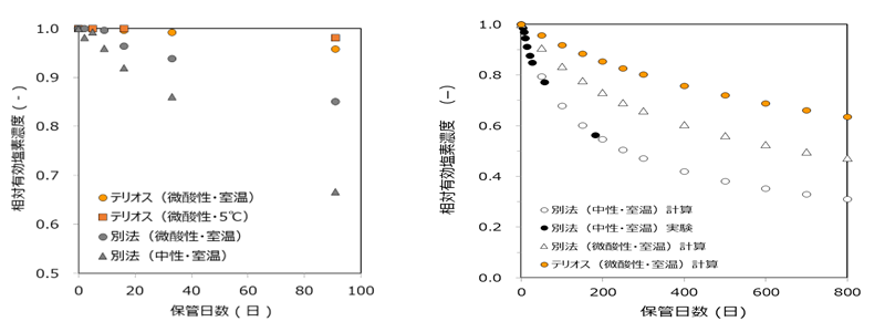 別法で製造した中性水では2年後には有効塩素濃度が原液の40%以下まで下がってしまう。一方、微酸性水は安定性が高く、2年後でも50%程度残っている。イオン交換法で製造した微酸性次亜塩素酸水はさらに高い安定性を示し2年後の次亜塩素酸残存率は70%程度となる。
